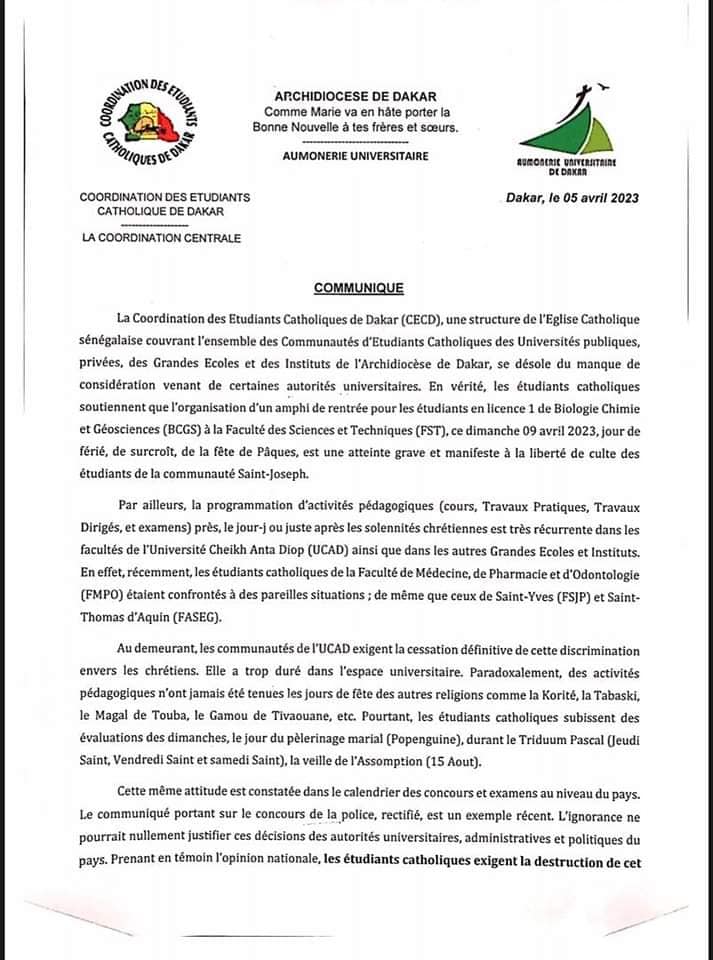 A Coordenação dos Estudantes Católicos de Dacar (CECD), estrutura da Igreja Católica senegalesa que abrange todas as Comunidades de Estudantes Católicos de universidades públicas e privadas, Grandes Escolas e Institutos da Arquidiocese de Dacar, lamenta a falta de consideração de algumas autoridades universitárias. Na verdade, os estudantes católicos defendem a organização de um anfiteatro de regresso às aulas para os alunos da Licenciatura 1 de Biologia, Química e Geociências (BCGS) da Faculdade de Ciências e Tecnologia (FST). Este domingo, 09 de abril de 2023, feriado, aliás, Páscoa, é um grave e manifesto atentado à liberdade de culto dos alunos da comunidade Saint-Joseph.