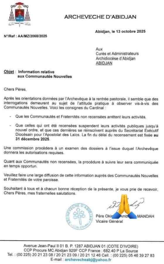 Le ton est désormais à la rigueur pastorale dans l’archidiocèse d’Abidjan ! Dans un communiqué adressé ce lundi 13 octobre 2025 aux curés et administrateurs de paroisses le Père Ambroise Okimou Mandah, Vicaire général de l’archidiocèse d’Abidjan, a annoncé la suspension des activités publiques des communautés nouvelles et fraternités non encore recensées. « Les Communautés et Fraternités non recensées doivent arrêter leurs activités », tandis que « celles qui ont été recensées suspendent leurs activités publiques jusqu’à nouvel ordre », indique la directive.